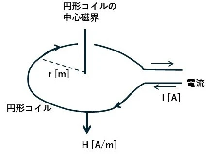 コイルの半径をr [m]、電流をI [A]、磁界の強さを H [A/m]とすると、磁界の大きさは次の式で表されます。