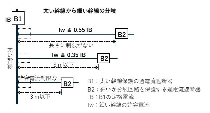 太い幹線から細い幹線へ分岐する場合、接続箇所に過電流遮断器を設置するのが原則です。